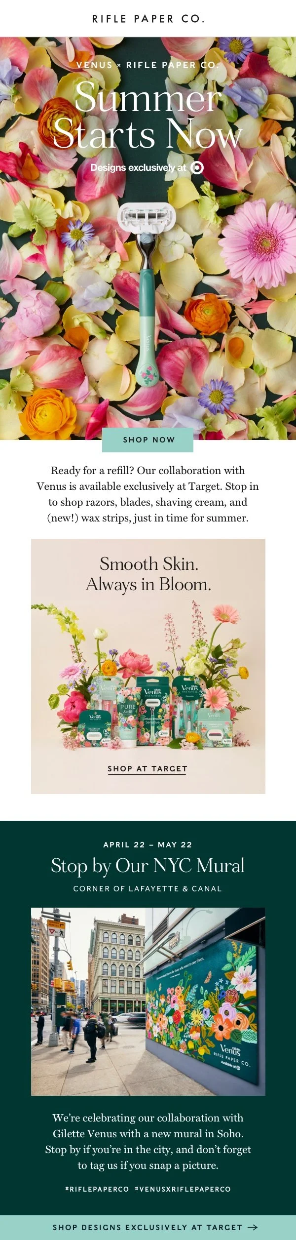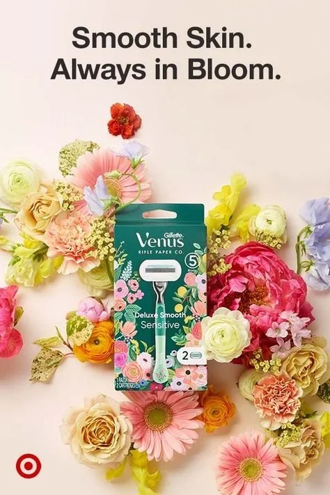 Challenge: Expand Rifle Paper Co.’s reach with a brand-forward campaign that differentiates the Gillette Venus collaboration from mainline Venus and competitors.As the lead Rifle Paper Co. creative, I developed a campaign that brought the collaboration to life in a brand-forward way, aligning with Rifle’s mission of “Bringing Beauty to the Everyday.” The campaign used floral visuals–evoking the act of shaving without being literal–to elevate the utilitarian product and the Venus brand. Under my creative direction, we partnered with Gillette and Target agencies to execute a 360° campaign featuring paid media, branded Target fixtures and end caps, a Target.com landing page, OTT video, and marketing activations.